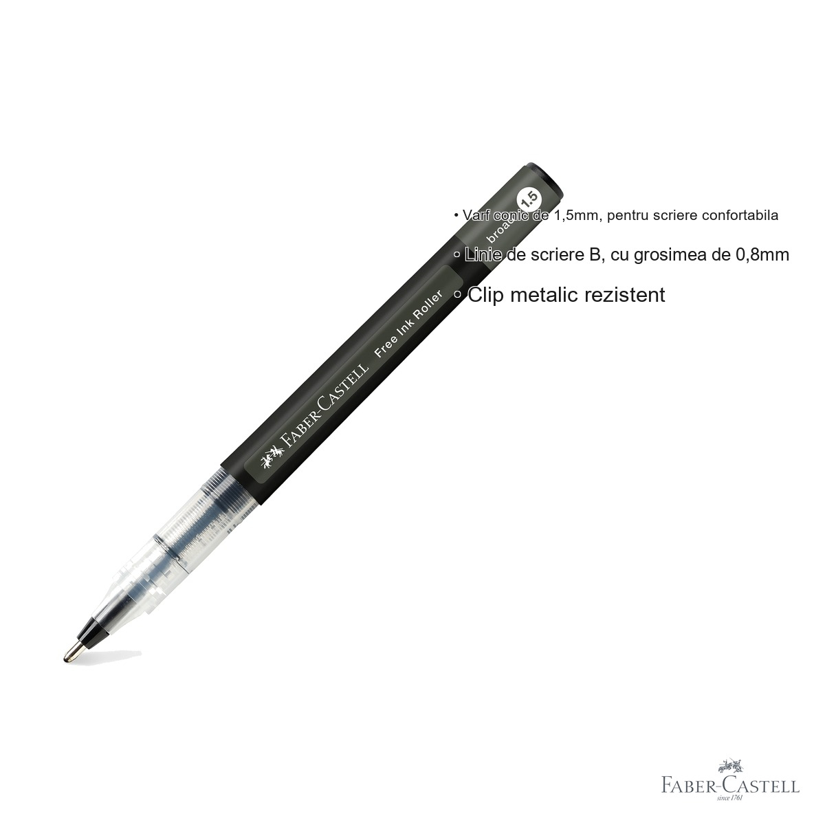 Rollerul Faber-Castell Free Ink negru se remarca printr-o serie de avantaje care il fac superior multor instrumente de scris obisnuite. Varful conic de 1,5mm asigura o scriere confortabila, reducand oboseala mainii chiar si in sesiunile lungi de scris. Fluxul constant de cerneala elimina intreruperile neplacute si petele, oferindu-ti o linie uniforma de la primul pana la ultimul centimetru. Linia de tip B, cu o grosime de 0,8mm, este suficient de pronuntata pentru a fi lizibila si eleganta in acelasi timp.