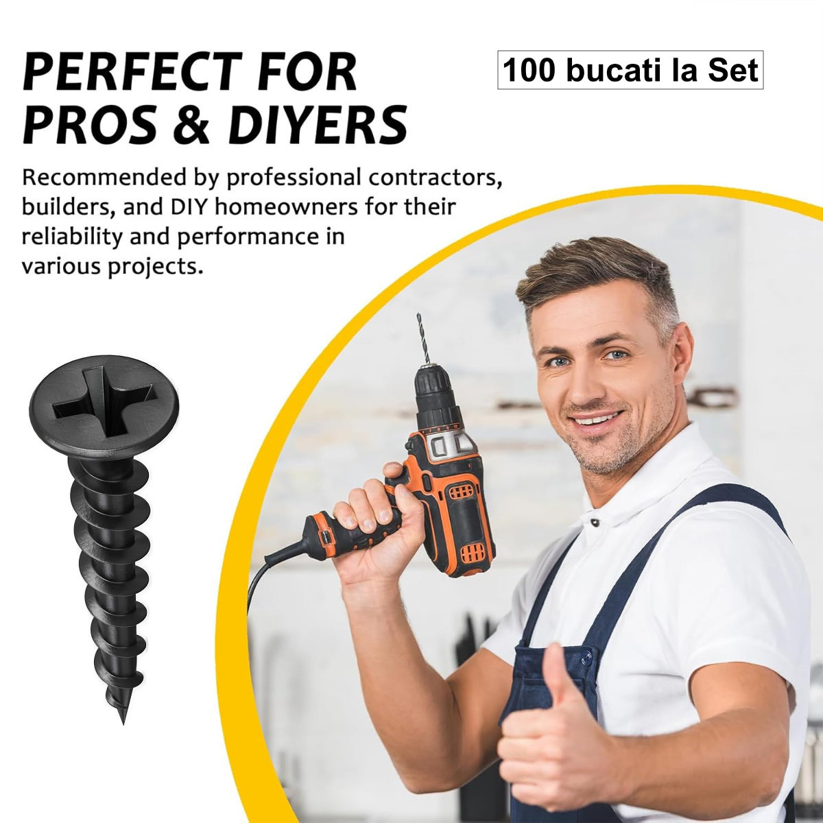 Acest set practic de 100 de suruburi este solutia ideala pentru a-ti finaliza lucrarea cu materiale profesioniste, fara a ramane cu un surplus mare.