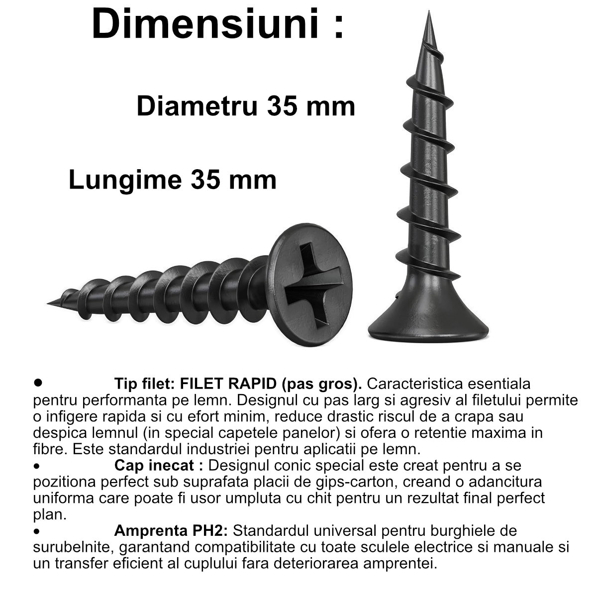 • Dimensiuni: 3.5 x 35 mm. Aceasta dimensiune universala este perfecta pentru majoritatea aplicatiilor cu placi de gips-carton pe suport de lemn.